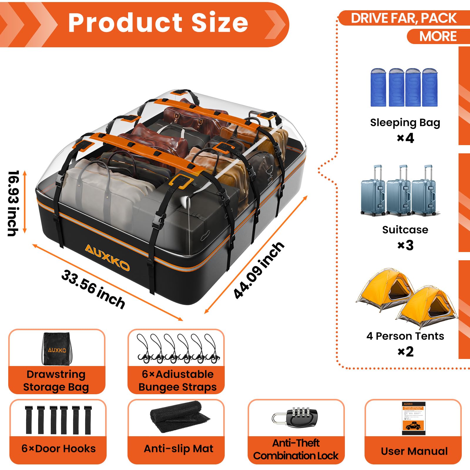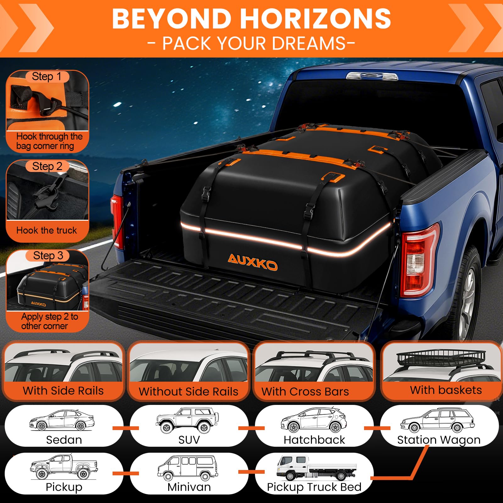 AUXKO 15 Cubic Ft Waterproof Rooftop Cargo Carrier for Truck Bed & All Vehicles with/without Roof Rack, Foldable Roof Bag with 6 Adjustable Bungee Straps, Combination Lock, Anti-Slip Mat, 6 Door Hooks