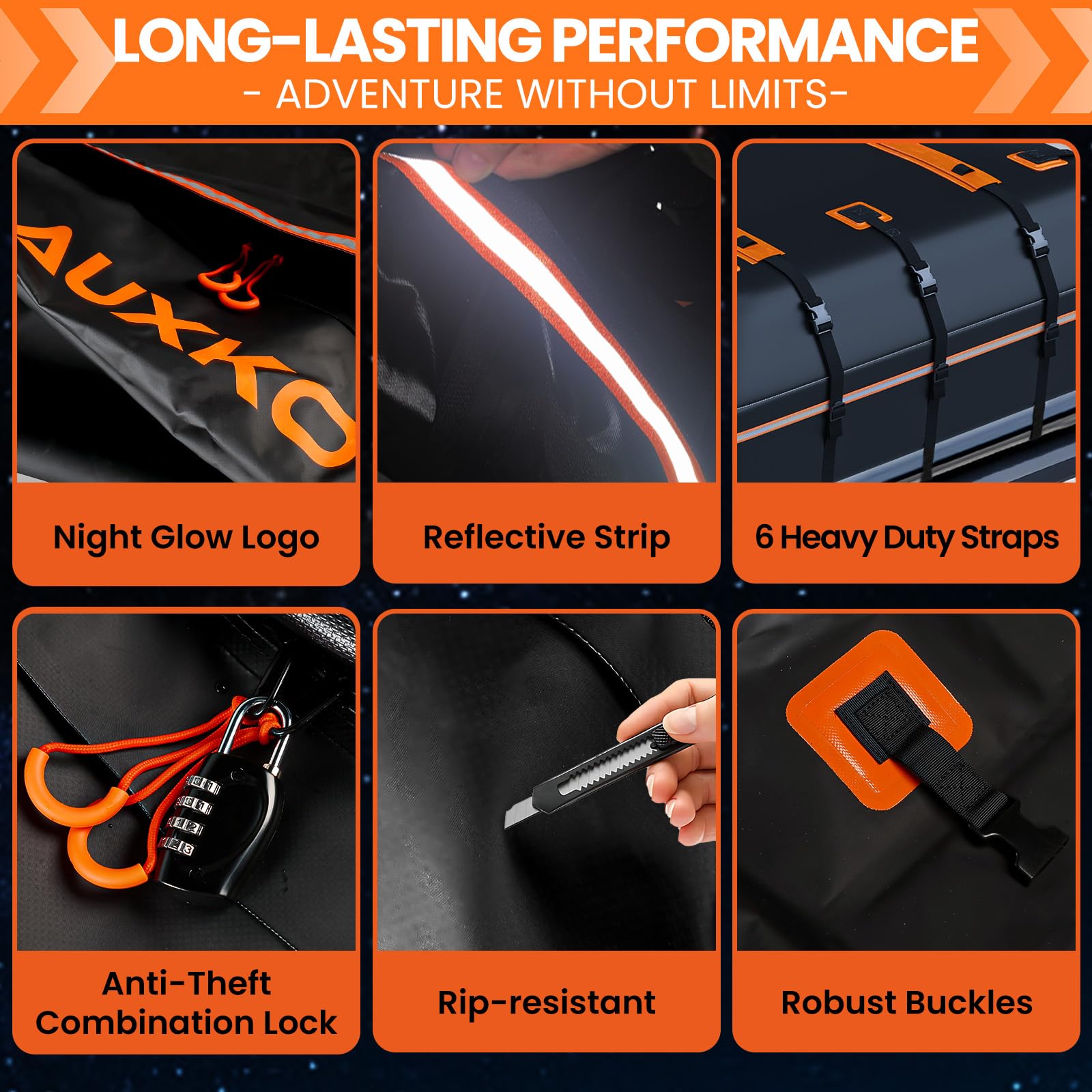 • Aerodynamic Design Cuts Wind & Noise: AUXKO’s 15 cubic ft rooftop cargo bag is uniquely designed with an angled front panel that reduces drag and wind resistance. Drive smoother, quieter, and save on fuel—especially at highway speeds.