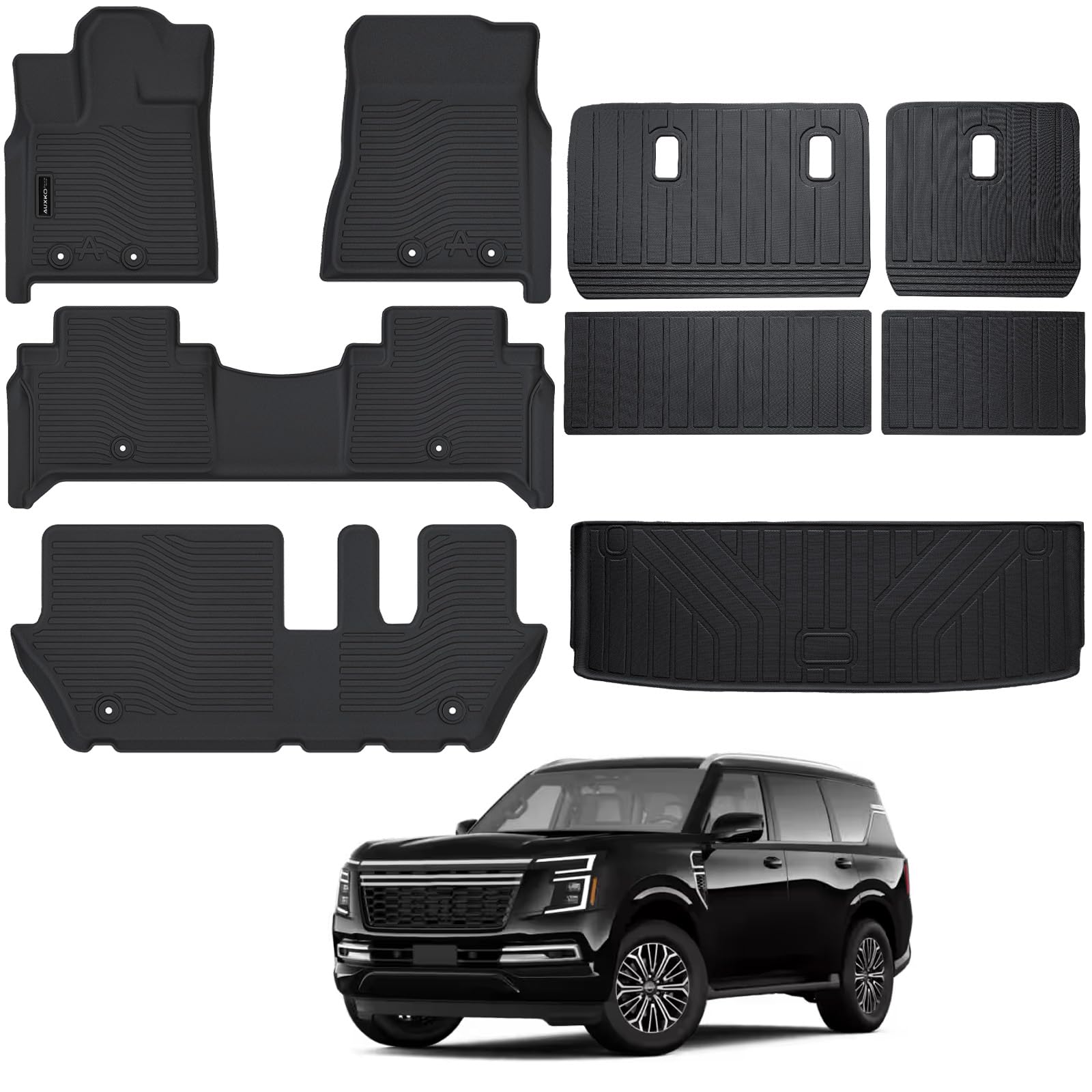 MOST APPROPRIATE MATERIAL:Auxko 2025 armada 8 seats accessories floor mats constructed from TPE (thermoplastic elastomer), Free of both latex and PVC, 100-percent recyclable, Odorless. Auxko mats liner for Nissan Armada 2025 are both soft and durable. More importantly, they'll hold up in extreme weather conditions, so you don't have to worry about cracking, curling, or the mats breaking down.