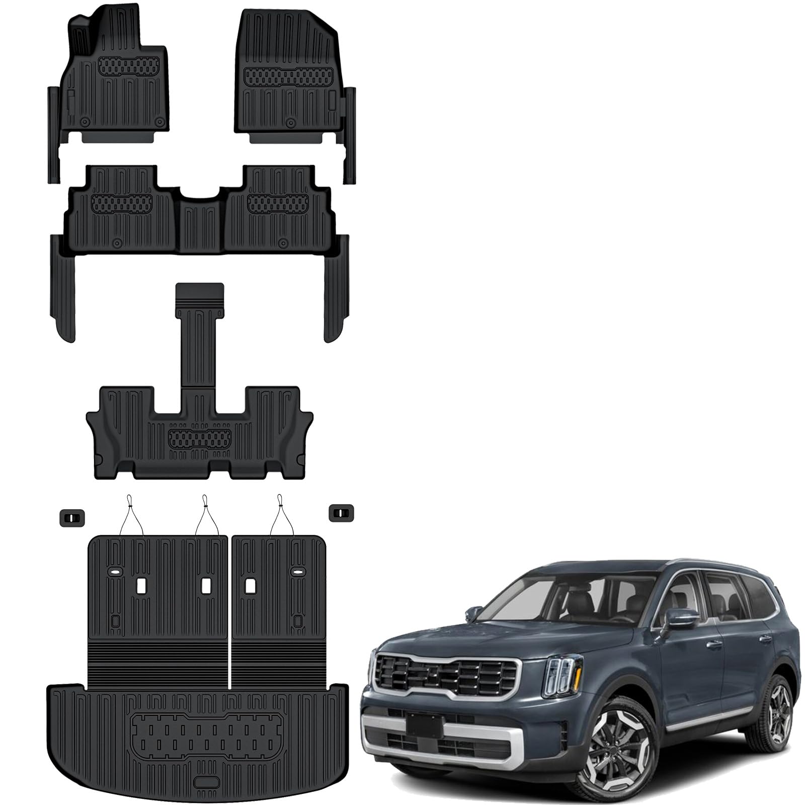 FITS LIKE A GLOVE: Auxko floor mats cargo liner with back seat protector for kia telluride 7&8 seats 2020-2025 are high-precision laser measured, meaning our custom fit will offer optimal coverage and look as if the mats came with yourtelluride 2025 2024 2023 2022 2021 2020. Auxko incorporates a specially designed retention system and non-slip nibs on the mats to keep them locked in place. Note: The Floor mats require a simple cutting to fit the 8-passenger seating.