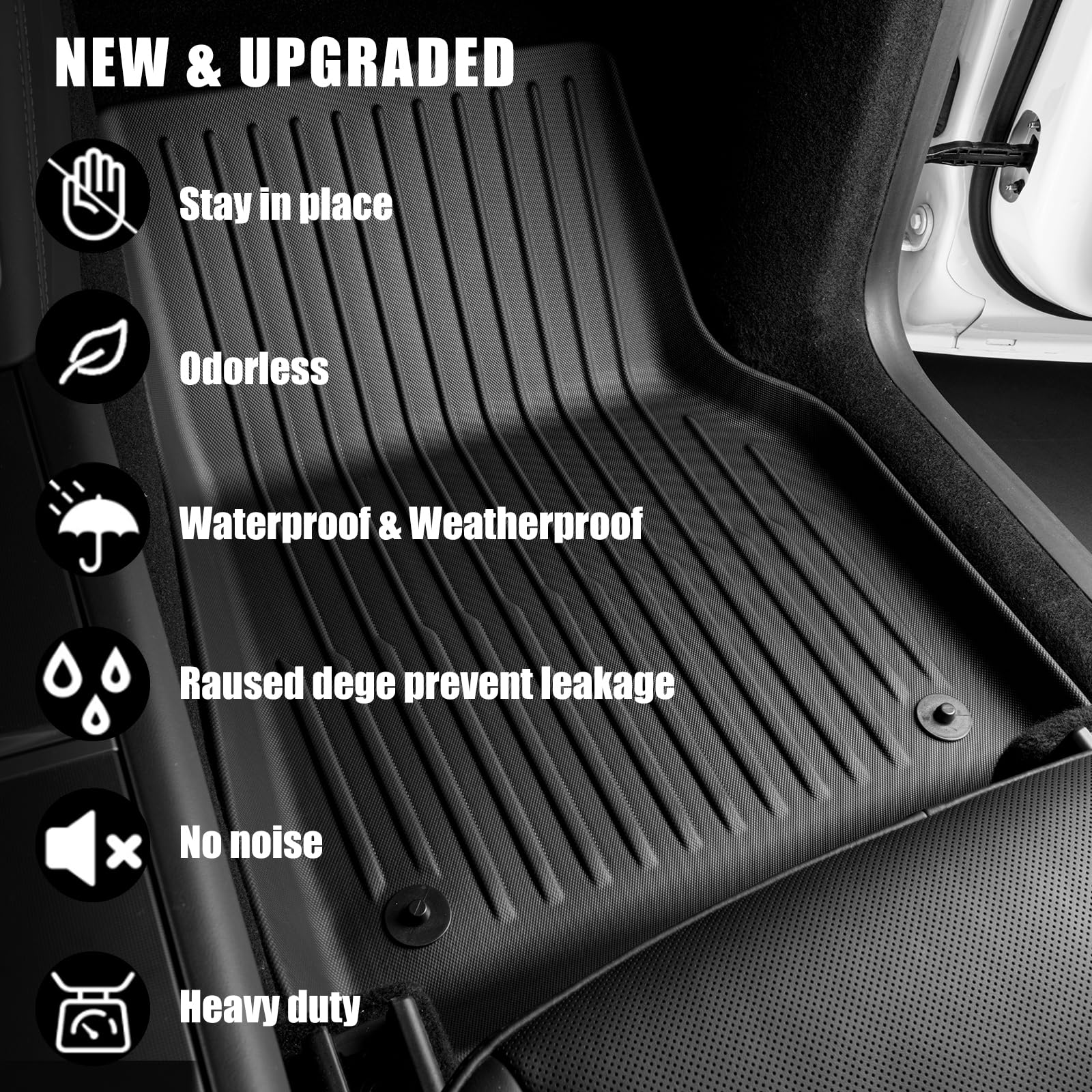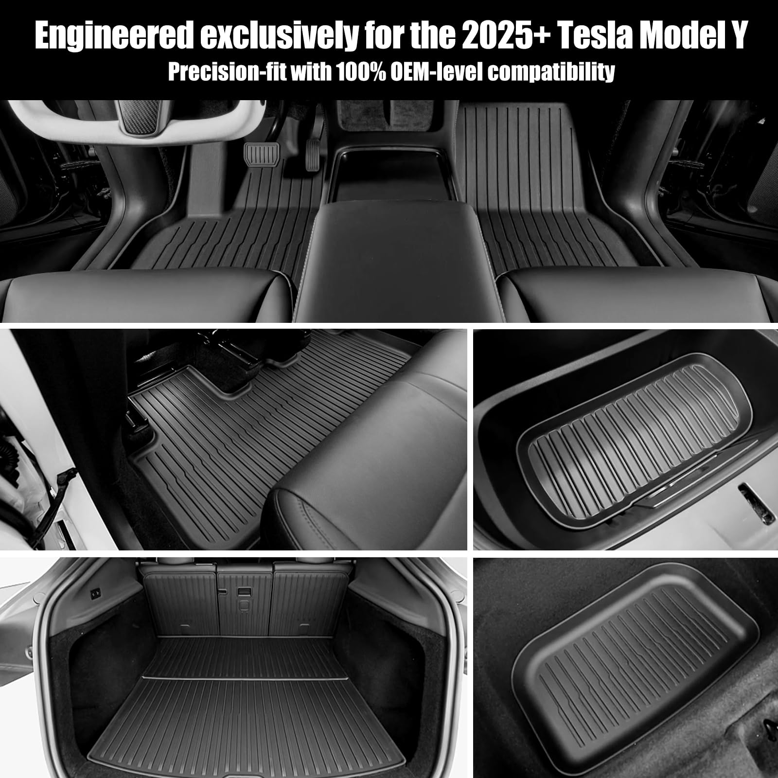 FITS LIKE A GLOVE: Auxko for Tesla Model Y Juniper 2026 2025 & Tesla New Model Y all weather floor mats & lower storage mat & front trunk liner & rear cargo mat with back seat protector car full mats set are high-precision laser measured, meaning our custom fit will offer optimal coverage and look as if the mats came with your Tesla New Model Y 2025 2026/Model Y Juniper. Auxko incorporates a specially designed retention system and non-slip nibs on the mats to keep them locked in place.